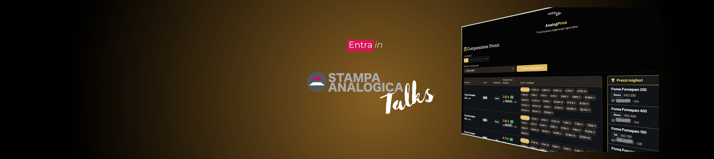 Stampa Analogica: storie e tecniche dalla camera oscura In Primo Piano il Blog di Stampa Analogica: articoli e risorse per la stampa in camera oscura Le tre fasi del fotografo analogico Paper Negative: Quando la Carta è un Opera d’Arte. Alla Scoperta del Proprio Stile: Un Viaggio tra Educazione Visiva, Tecnica e Creatività Da Bergman a Zaillian: Quando il cinema parla ai fotografi 5 stupende fotocamere analogiche per iniziare a scattare in pellicola SMETTI DI PAGARE TROPPOPER I TUOI RULLINI Confronta i prezzi in Italia ed Europa e risparmia su ogni scatto AnalogPrice è incluso nel tuo abbonamento TALKS Silver News : le novità dal mondo della fotografia analogica il Blog di Stampa Analogica: articoli e risorse per la stampa in camera oscura monopan 50 leica, leica monopan prezzo, adox hr 50, leica rullino 35mm, rullino bianco e nero leica, Silver News Leica lancia il rullino Monopan 50 per celebrare 100 anni monopan 50 leica, leica monopan prezzo, adox hr 50, leica rullino 35mm, rullino bianco e nero leica, Silver News monopan 50 leica, leica monopan prezzo, adox hr 50, leica rullino 35mm, rullino bianco e nero leica, Silver News Pellicole bianco e nero, Kentmere PAN 200, Kentmere, Silver News Kentmere PAN 200: Harman Lancia la Nuova Pellicola B/N a Contrasto Elevato Pellicole bianco e nero, Kentmere PAN 200, Kentmere, Silver News Pellicole bianco e nero, Kentmere PAN 200, Kentmere, Silver News Pentax half size, Nuova camera pellicola, Pentax 17 Pentax 17, il ritorno del formato half-size ispirato dai giovani fan della fotografia analogica Pentax half size, Nuova camera pellicola, Pentax 17 Pentax half size, Nuova camera pellicola, Pentax 17 tecnologia retrò, vintage camera, generazione z, retro revival Il trend positivo del retro revival e la tech nostalgia tecnologia retrò, vintage camera, generazione z, retro revival tecnologia retrò, vintage camera, generazione z, retro revival Generazione Z, fotografia analogica, 2024 fotografia analogica Cosa è successo alla fotografia analogica nel 2024? Generazione Z, fotografia analogica, 2024 fotografia analogica Generazione Z, fotografia analogica, 2024 fotografia analogica CAMERA OSCURAdalla A alla Z Dallo scatto alla stampa, in Talks ci confrontiamo ogni giorno sui nostri percorsi, domande e soluzioni. Talks — Oggi dalla community — ENTRA IN TALKS MISURE E CALCOLI ANALOGICI
