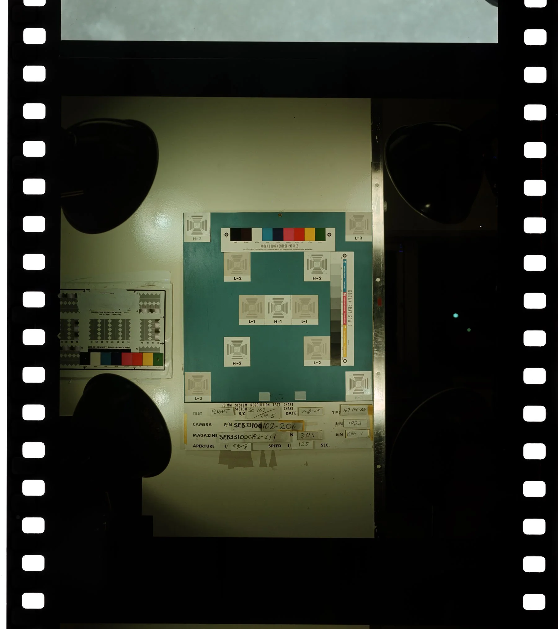 La risoluzione era di 80 lp/mm, circa la metà della Panatomic-X, ma sufficiente per la documentazione fotografica di superficie. Il Magazine S dell’Apollo 11, quello che contiene il ritratto di Aldrin, le impronte e la bandiera, era caricato con Ektachrome EF SO-168.