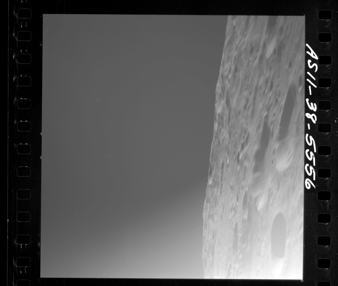 AS11-38-5589 - Magazine O (AS11-38), Panatomic-X SO-164 con fori di trascinamento, bianco e nero, ASA 80. Ripresa orbitale della superficie lunare dal Command Module, obiettivo Sonnar 250 mm.