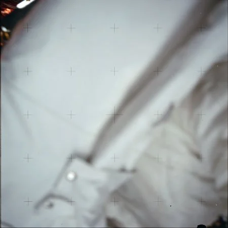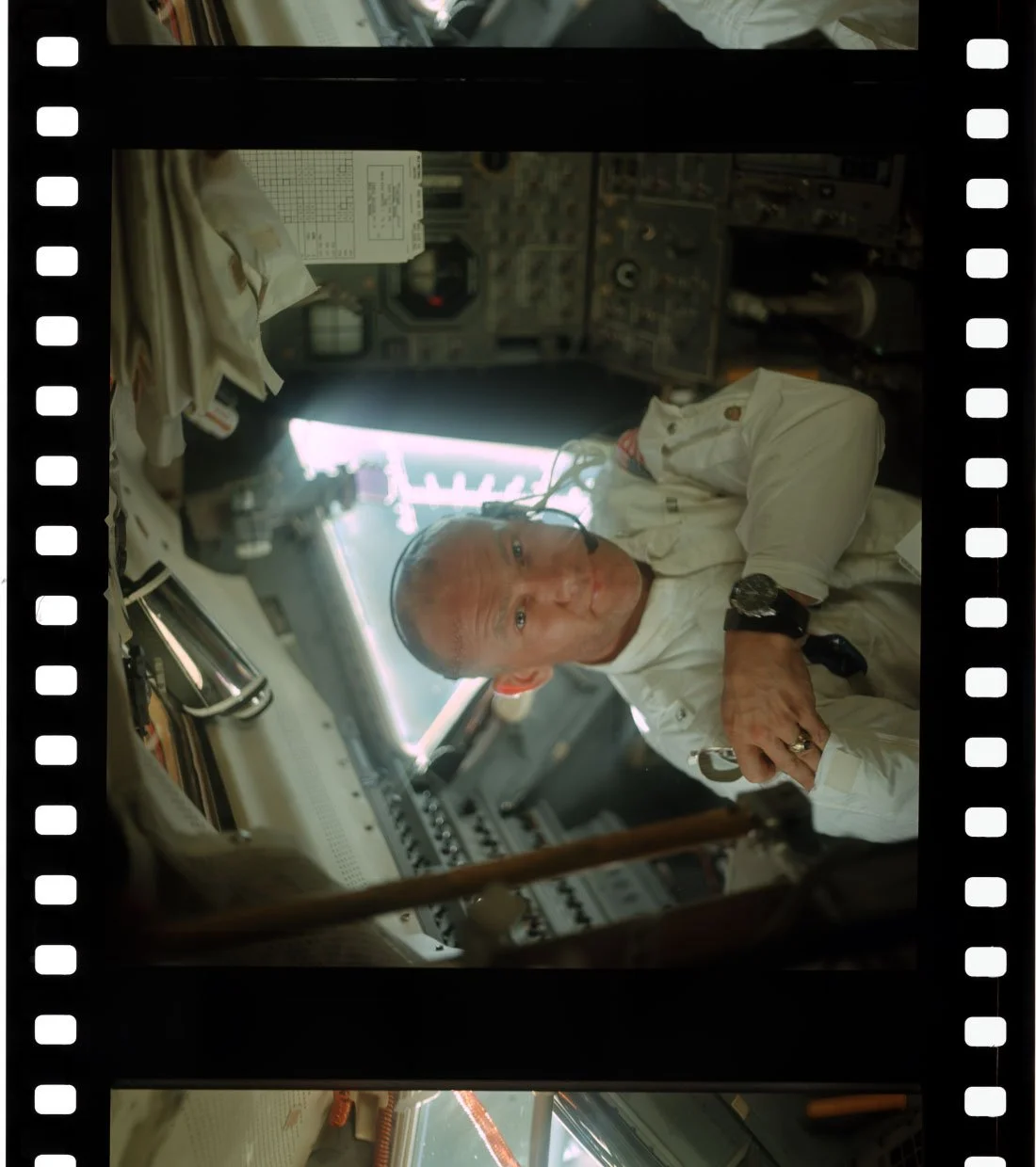 È esattamente questo fotogramma che Saunders ha recuperato per la copertina di Apollo Remastered, estraendo dal file raw a 16 bit i dettagli del volto, della tuta e dell'interno del Command Module che l'emulsione Kodak aveva registrato ma che nessun processo di stampa aveva mai rivelato. Le perforazioni laterali sono quelle del formato 70mm.