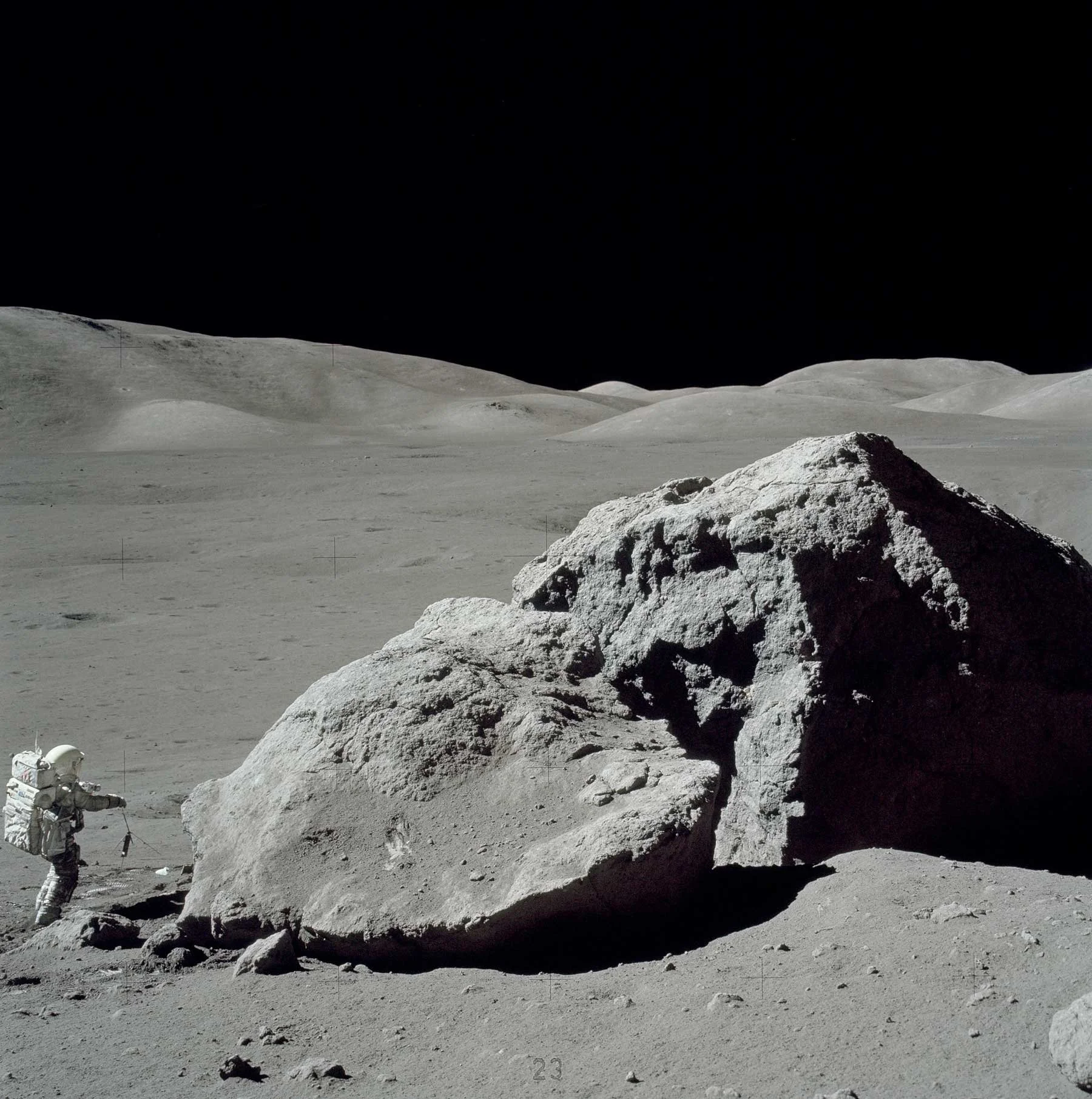 L'astronauta-geologo Harrison Schmitt (il primo geologo a mettere piede sulla Luna) raccoglie campioni accanto al grande masso di breccia alla Station 6, valle di Taurus-Littrow, dicembre 1972.
