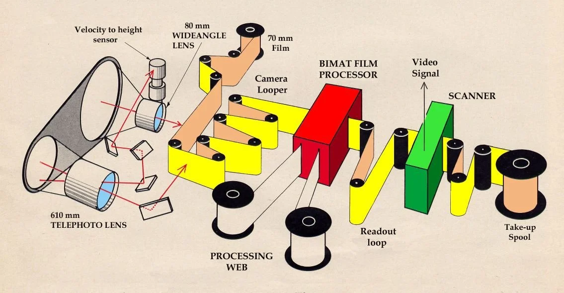 A terra, il segnale video era convertito in un’immagine su tubo catodico e riproiettato su pellicola 35 mm in una motion camera continua.
